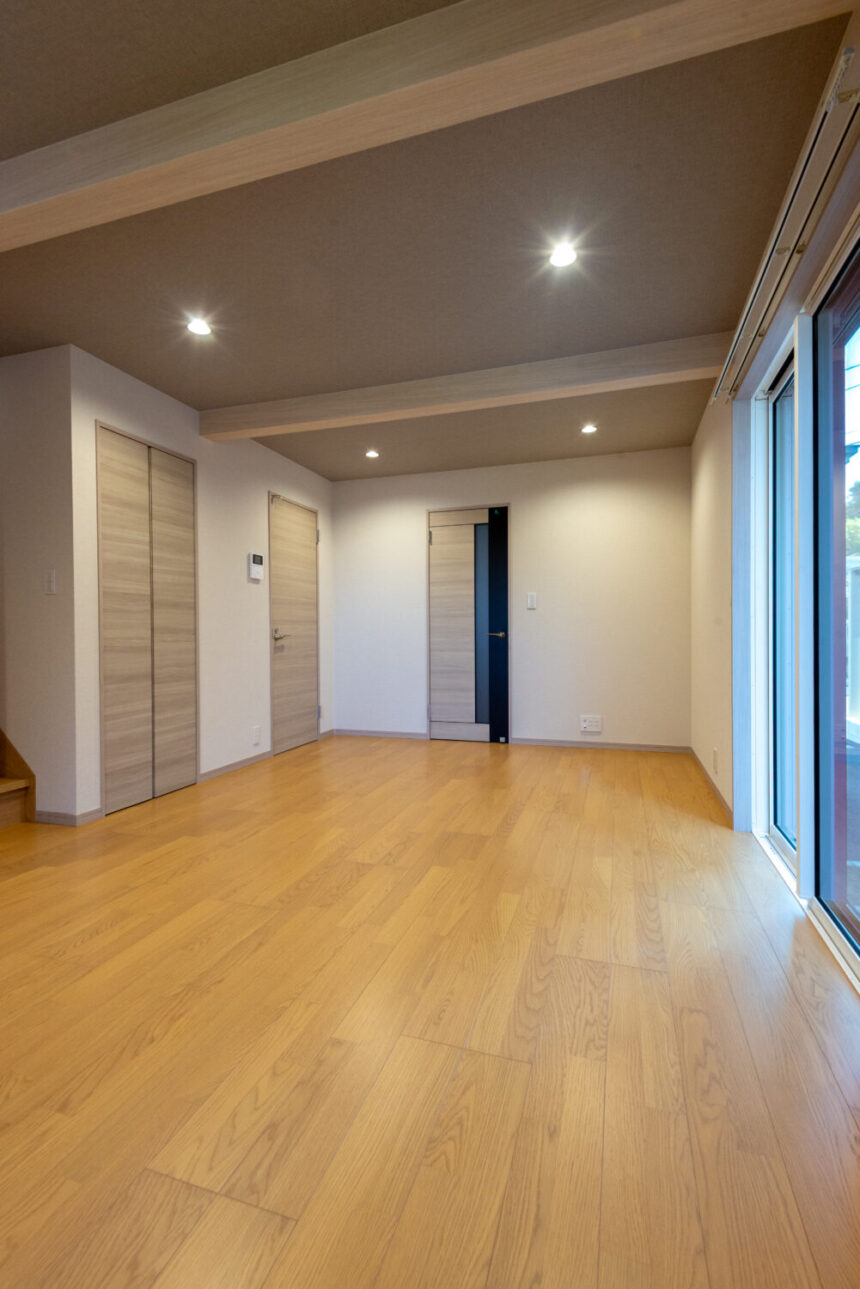 見せ梁がアクセントのリビングは、明るい色合いでまとめて明るい雰囲気に。
